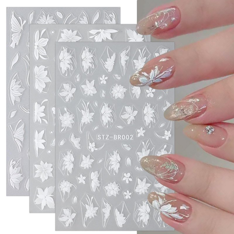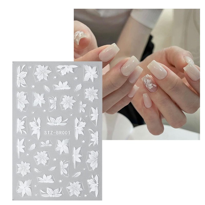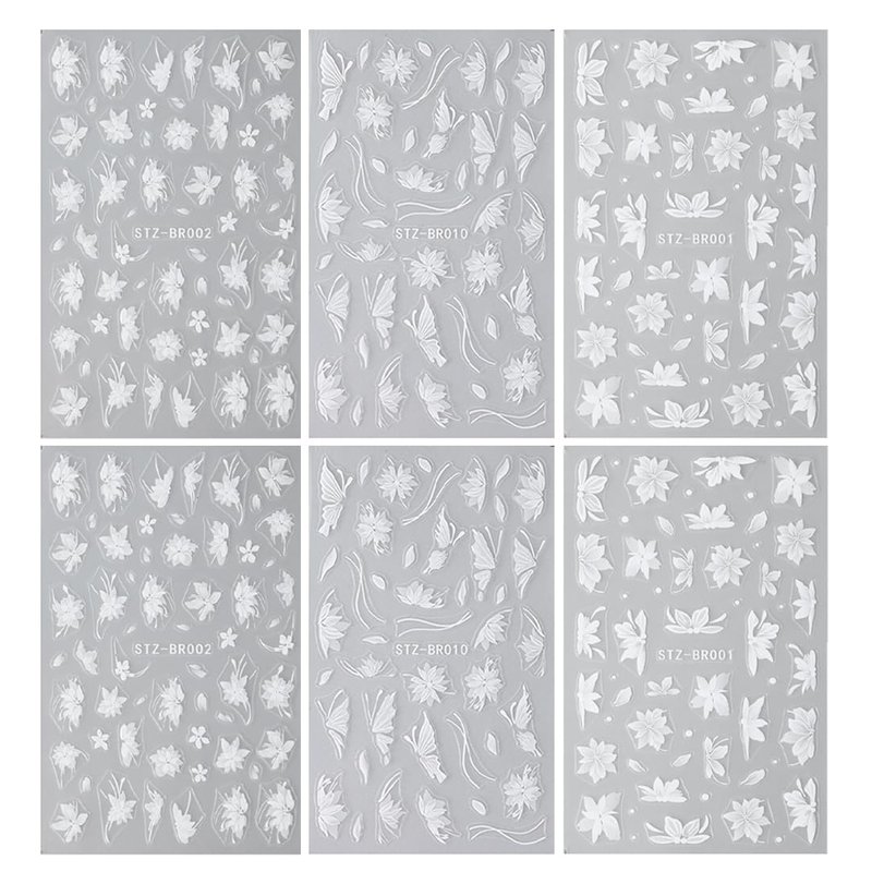 JMEOWIO 6 Sheets 3D Embossed Flower White Nail Art Stickers Decals Self-Adhesive Pegatinas Uñas 5D Spring Summer Floral Nail Supplies Nail Art Design Decoration Accessories