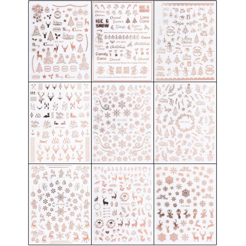JMEOWIO 9 Sheets Christmas Nail Art Stickers Decals Self-Adhesive Pegatinas Uñas Navidad Rose Gold Winter Holiday Xmas Snowflake Nail Supplies Nail Art Design Decoration Accessories
