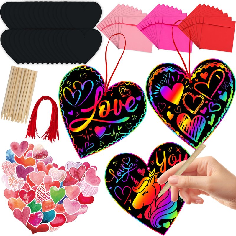 - Complete Valentine's Art Set-This Valentine's Scratch Art Kit includes everything you need for hours of creative fun! You’ll receive 44 heart-shaped scratch cards, 44 envelopes, 44 wooden styluses, 44 red strings and 50 Heart Stickers in an elegant gift box. Perfect for classroom activities, school prizes or Valentine’s Day crafts!