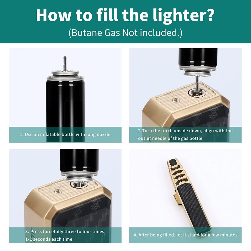 How to properly refill Step: 1. There is a gas control device inside this lighter, when the gas is added to a certain amount, it will automatically leak to the outside. When you refill, be sure to use an inflatable bottle with this long nozzle. 2. When inflating, make sure that there is no visible flame or kind of fire nearby to ensure that the air is smooth during inflation. Hold the gas bottle in your hand and wave it several times to warm it up. 3. Align the gas nozzle of the inflatable bottle with the air inlet of the lighter vertically. The air inlet of the lighter must face upwards and align with the outlet needle of the gas bottle. 4. Insert the air inlet forcefully, inflate vertically, press three to four times in a row, pressing forcefully for 3 seconds each time. If there is a large amount of gas escaping, it is because the pressure is not strong enough or the lighter is full. 5. After being filled, let it stand for 30 seconds to one minute, wait until the temperature of the lighter is restored, and then use it again. Attention: 1. The gas should be filled in the place without normal flame. The lighter gas is heavier than air, so the gas overflowing during the injection may stay in the lower places such as the table and the floor, which is more dangerous. Pay attention to and extinguish the fire. 2. Do not ignite when filling gas. 3. Before filling gas, adjust the flame adjustment device to (-) direction. Safety Notices -Keep it out of reach of children; -Keep away from your own face and clothes and body and others, especially children, when using it; -Avoid high temperatures above 45 ℃ and avoid long-term direct sunlight; -The filling liquid is a flammable liquid; -Do not knock or put in fire; -It must be confirmed to turn off after use.