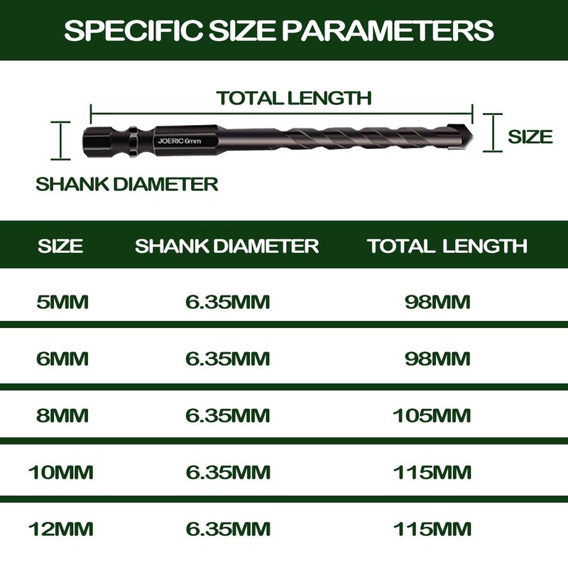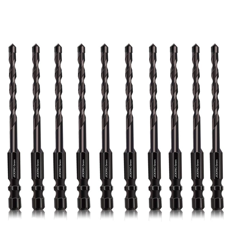 JOERIC 5mm Masonry Drill Bit Set 10PC 3/16” Concrete Drill Bit Set- Ceramic Brick Drill Bit Industrial Cemented Carbide Tip YG6X, Hex Shank for Glass, Soft Ceramic Tile, Mirror, Plastic.