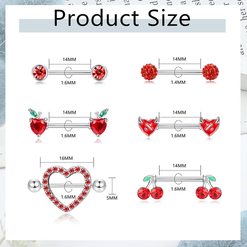 - Size & Specifications: Nipple piercing jewelry gauge size: 14G(1.6mm), cherry nipple ring, apple nipple ring, devil nipple ring and ball nipple ring bar Length: 14mm, heart nipple ring bar Length: 18mm, ball diameter: 5mm. The size is suitable for most people, comfortable to wear, avoiding the size difference trouble, perfect size of nipple piercing, keep you happy every day.