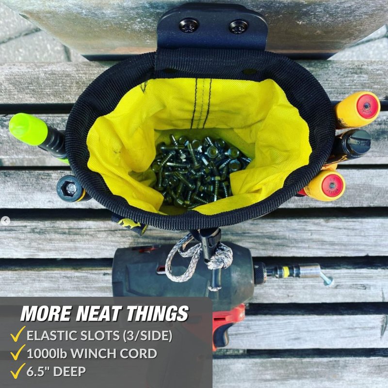 - KEEP YOUR HARDWARE CLOSE AT HAND | Wide opening and a stiff reinforced rim make this a great nail, screw, bolt, tape, or accessories bag. Cinch the top shut to keep your hardware secure when not in use.