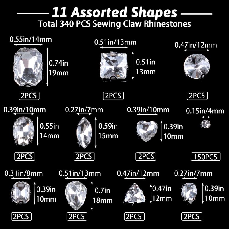 11 Style: Each sew on gems is made of a large diamonds, there are 4 copper claws tightly, ensure that the diamond will not fall off, strong and durable, beautiful and exquisite; large quantities and assorted shapes, there are assorted shapes, which can meet your various needs.