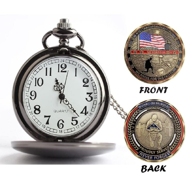 Best Gifts for Veterans It include a pocket watch and challeng coins,which come in gift box packaging,Great gift for military veterans who service in United States Navy, Army, Air Force, Marines Corps, & Coast Guard. Perfect present as a token of gratitude, appreciation,or encouragement. The words on the front side of the coins We Stand for the Flag and We Kneel for the Fallen The words on the back side of the coins Always Remember and Never Forget: Duty-Honor-Courage-Proudly Served