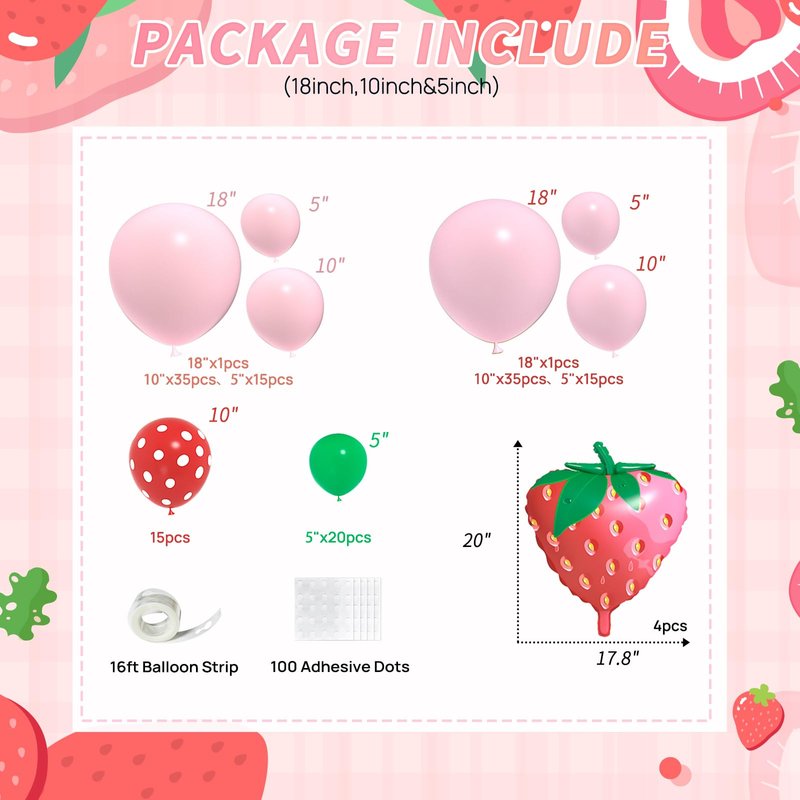 - AFFORDABLE STRAWBERRY BALLOON ARCH KIT: Create a stunning strawberry wonderland with our 147-Pack! Includes 51pcs light pink balloons, 51pcs pastel pink balloons, 20pcs green balloons, 15pcs red polka dots balloons, 4pcs strawberry foil balloons, 1pcs balloon strip, and 5pcs adhesive dots. Let the vibrant energy of strawberries bring unforgettable joy to your party memories!