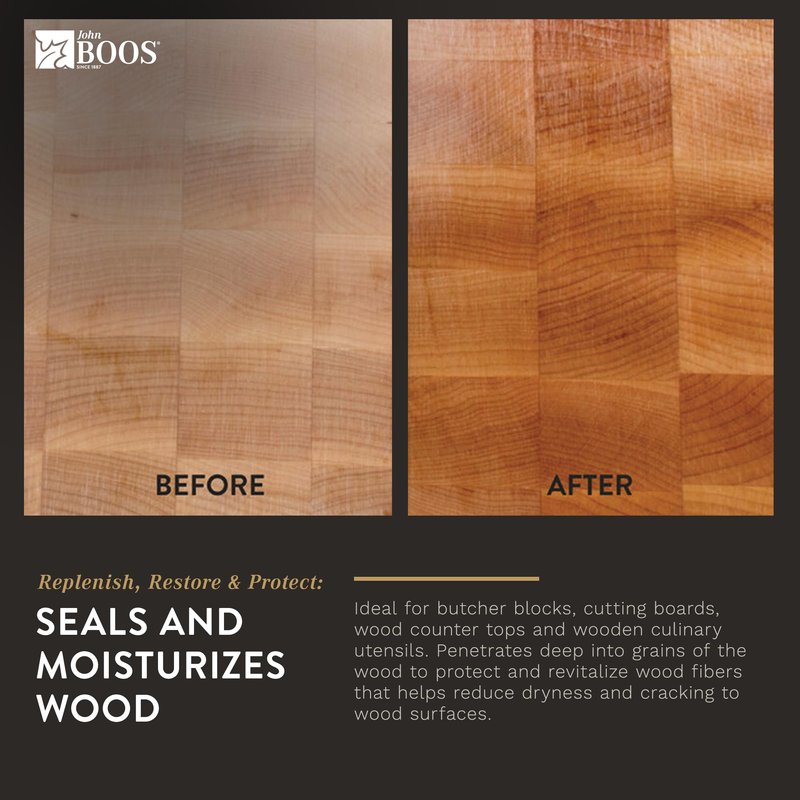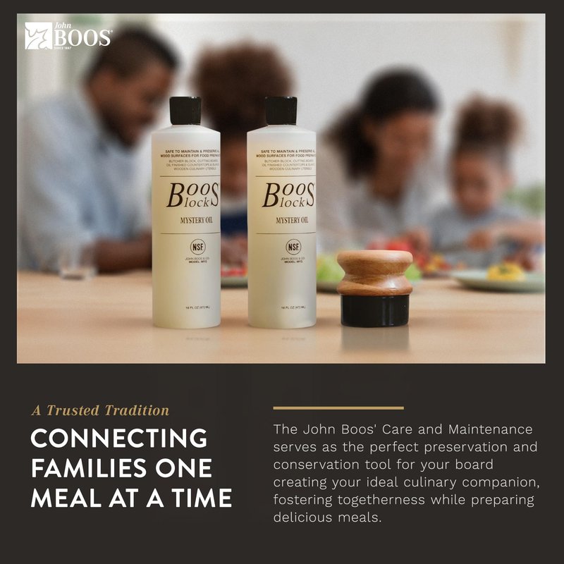 - Easy Care: Apply an even amount of Mystery Oil once per month and let it penetrate the wood fibers overnight. Pair it with John Boos Board Cream (sold separately) for extra wood surface moisture.