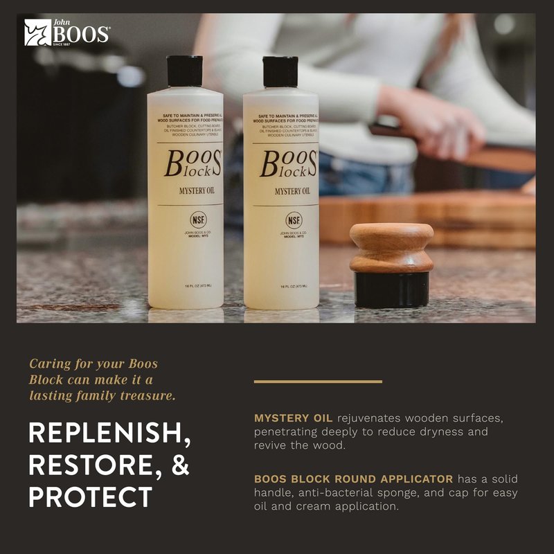 - Wood Cutting Board Oil & Applicator: Pamper and prep the wood of your John Boos chopping blocks, cutting boards, or charcuterie boards with our Boos Block Mystery Oil and applicator sponge.