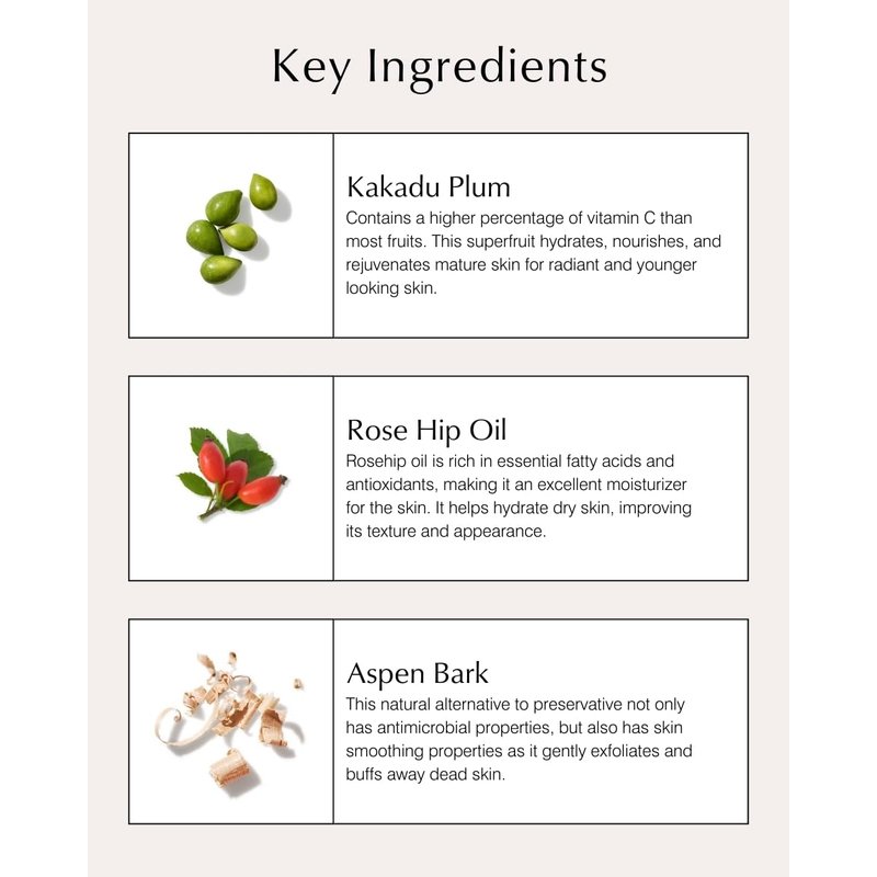 - Kakadu Plum - 50% more vitamin c than oranges; brightens and helps to reduce the appearance of fine lines and wrinkles
