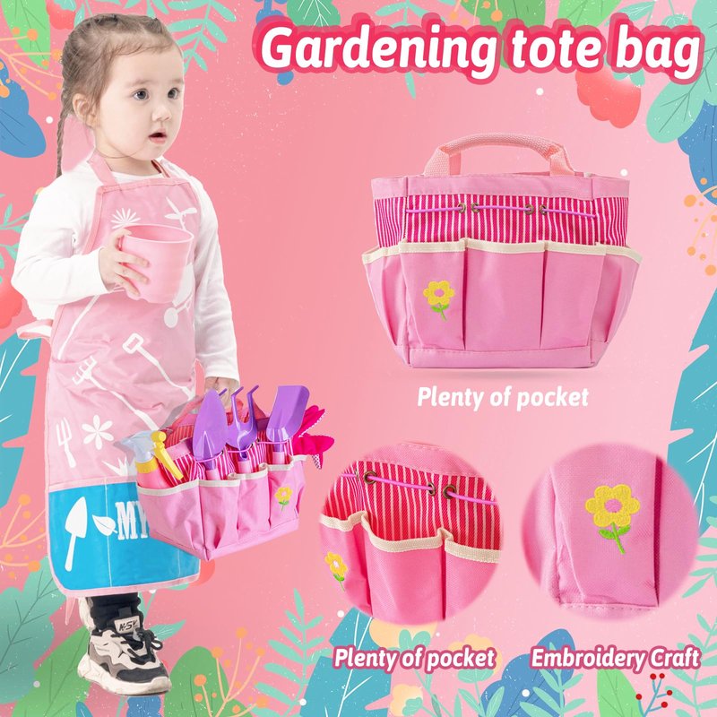 - 🌸 Complete Kids Pink Gardening Tools Set: Includes everything your little girl needs for gardening adventures – a rake, fork, trowel, watering can, gloves, apron, tote bag, plant pots, and DIY bookmark kits.