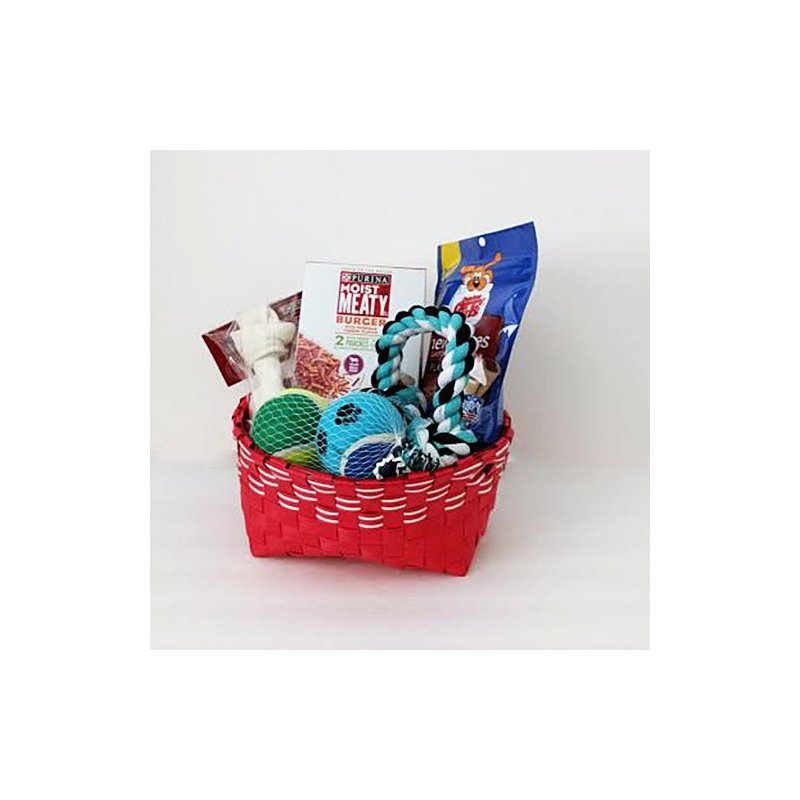 - package include: 2- balls 1- dog crewing toy 3- assorted Dog Treats 1- Basket