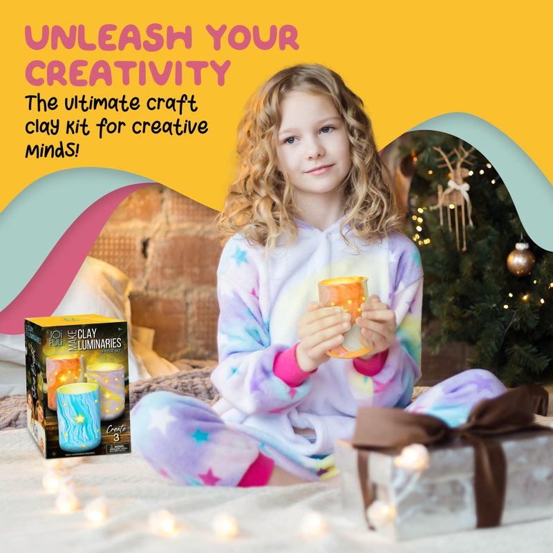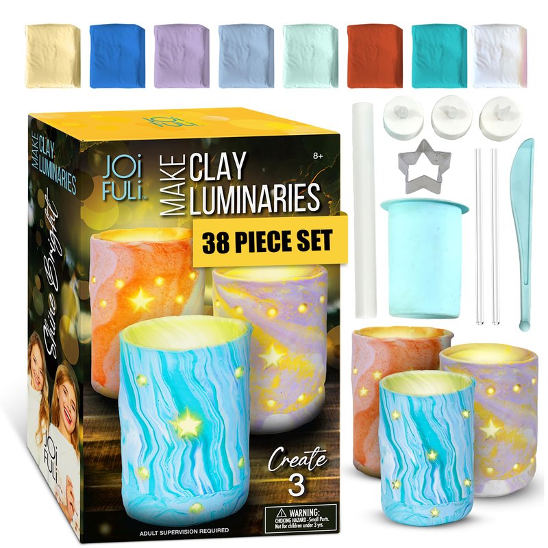 Unleash creativity with the JOiFULi DIY Clay Luminaries Craft Kit! This comprehensive set includes everything you need to create 3 unique clay luminaries: vibrant polymer clay, a luminary mold, a plastic knife, a roller, a tube, 3 flameless LED tea lights, and easy-to-follow instructions. Perfect for craft kits for girls ages 8-12, as well as boys and teens, this kit offers an engaging way to explore art and crafts. Kids can choose from 15 vibrant clay colors to design and personalize their luminaries, mixing and kneading the clay to craft one-of-a-kind designs. This hands-on activity encourages artistic expression and is ideal art and crafts for kids ages 8-12.. The non-toxic polymer clay is easy to work with, though it does require kneading before rolling and baking at 275°F for 15-20 minutes. Adult supervision is recommended to ensure proper baking results. Whether it's for activities for kids ages 8-12, birthday parties, sleepovers, or family gatherings, this kit is a fantastic choice for a screen-free, creative experience. It makes an excellent gift for kids and teens, providing hours of fun while creating beautiful, personalized luminaries. For those seeking crafts for teens or looking for engaging fun crafts, this DIY kit offers both challenge and reward.