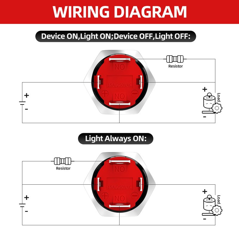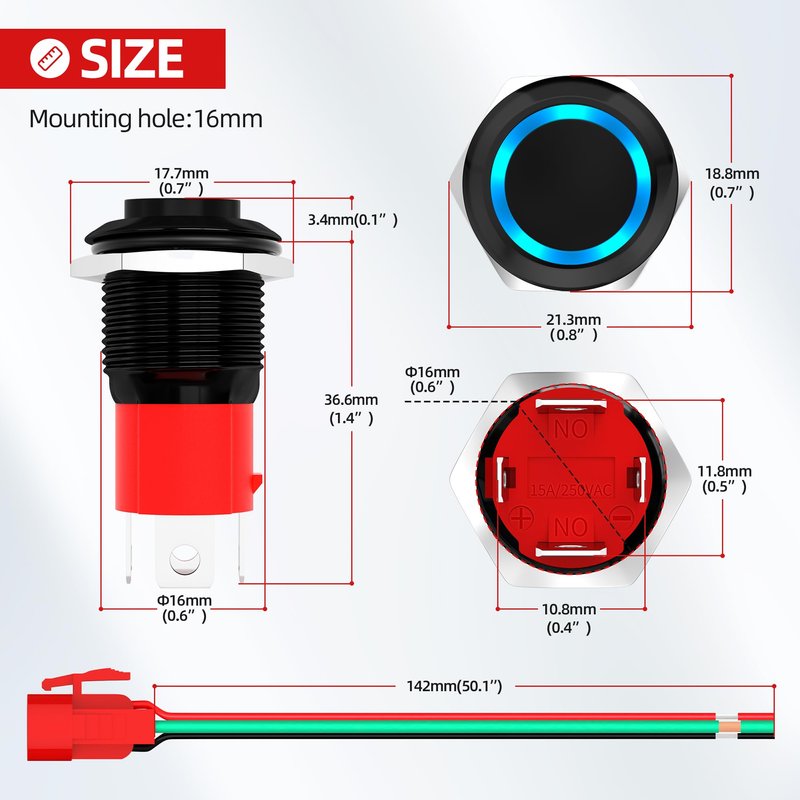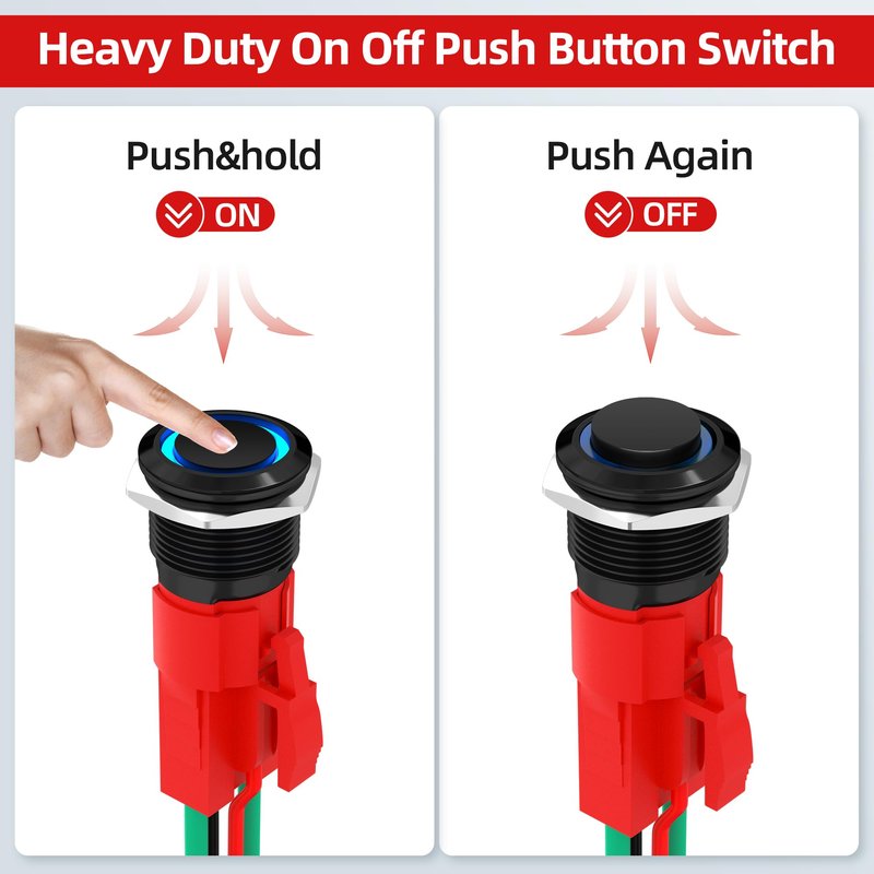 Easy Mounting: The Mounting hole diameter of this 12 Volt round push button switch is 16mm. And for your convenience, wiring harness will be included in the package. All you have to do to finish the wiring is just to plug the 12 volt switch into the socket. Safe and easy.