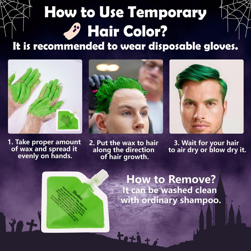 - Green Temporary Hair Wax: Wear disposable gloves, squeeze an appropriate amount of hair wax on the palm of your hand, rub it well and grab it on dry hair. Apply it evenly and wait for the hair to dry