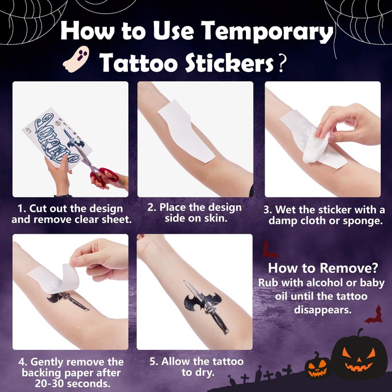 - Joker Tattoos: Apply the tattoo stickers on dry skin and wet them. Remove the backing paper after 20 seconds to get a realistic tattoo. The tattoos can last for 2-4 days