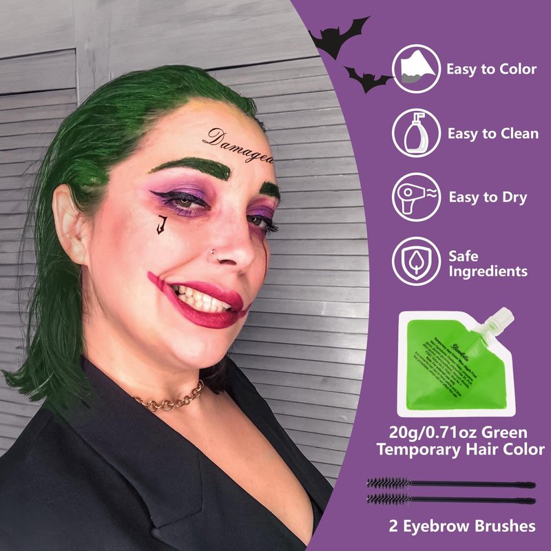 - Product Includes: 6 sheets Joker tattoos temporary (9x5.5 inches) and 20g of green temporary hair wax. The 20g hair wax is enough for 2-3 short hairstyles or 1 medium to long hairstyle. Enough for a complete Joker cosplay