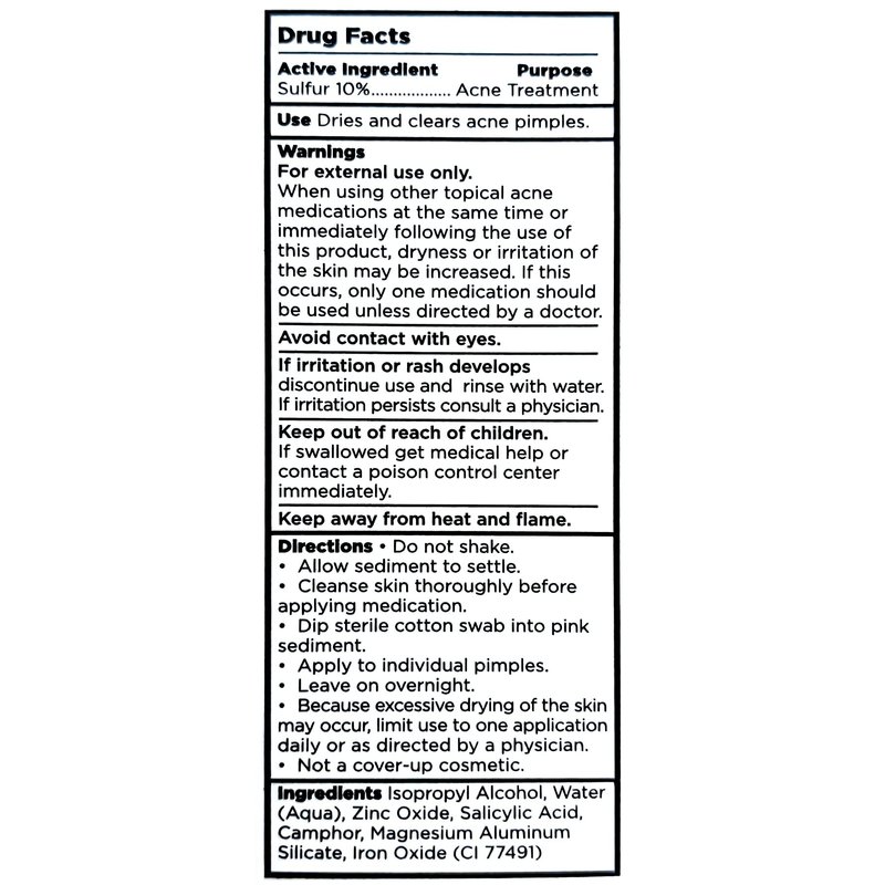An overnight spot treatment to rapidly reduce the size and severity of pimples. Maximum strength sulfur exfoliates dead skin cells, allowing the all-natural drying agents to penetrate pores and treat infection. This Anti-Blemish Drying Lotion is a formulation that helps reduce blemishes and isolated breakouts, thus restoring the skin to a normal smooth appearance. Sulfur 10% is an occurring mineral that can help to clarify acneic skin by helping to shed excess skin cells. DIRECTIONS: Do not shake. Allow sediment to settle. Cleanse skin thoroughly before applying medication. Dip sterile cotton swab into pink sediment. Apply to individual pimples. Leave on overnight. Excessive drying of the skin may occur, limit use to one application daily.