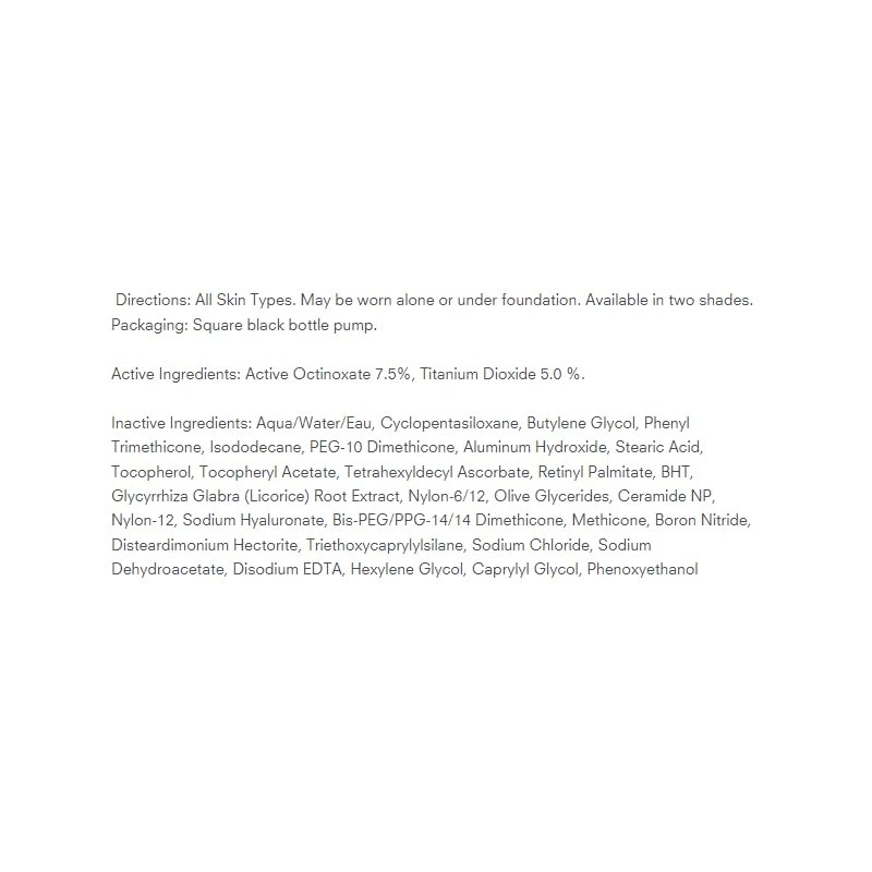 Undetectable, light, creamy fluid tinted primer smooths skin , evens tone and warms the complexion with a subtle radiance. Enriched with a blend of Hyaluronic Acid and age-defying Ceramides to help improve skin hydration and overall skin integrity. This oil-free formula helps minimize the appearance of large pores, and protects against both UVA and UVB rays. Hypoallergenic. Fragrance and Paraben free. For all skin types. May be worn alone or under foundation. Available in two shades. 1.20 fl. oz. (36 ml)