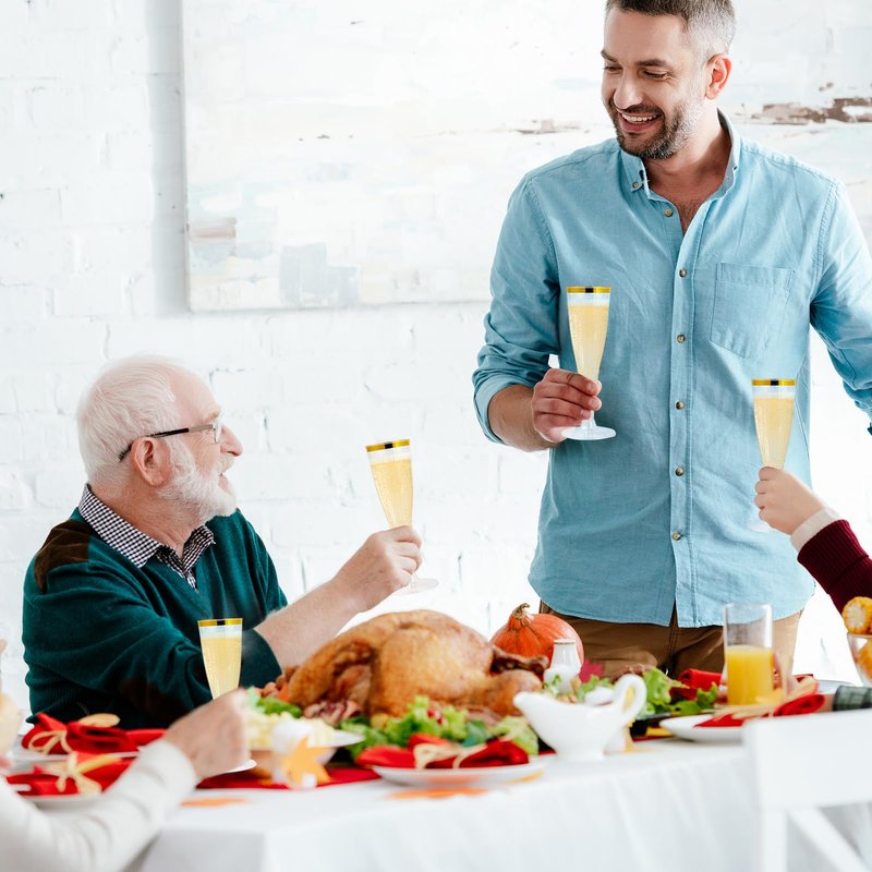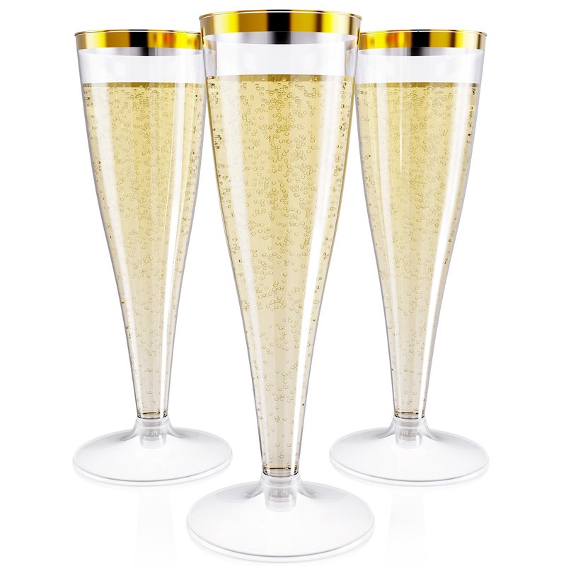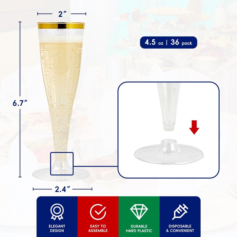 - ELEGANT DRINKWARE: In any casual or formal event, use these amazing transparent plastic champagne flutes to sip your beverages in an outstanding style. These gold rimmed plastic champagne glasses are designed to create a stylish splash and bring superior elegance