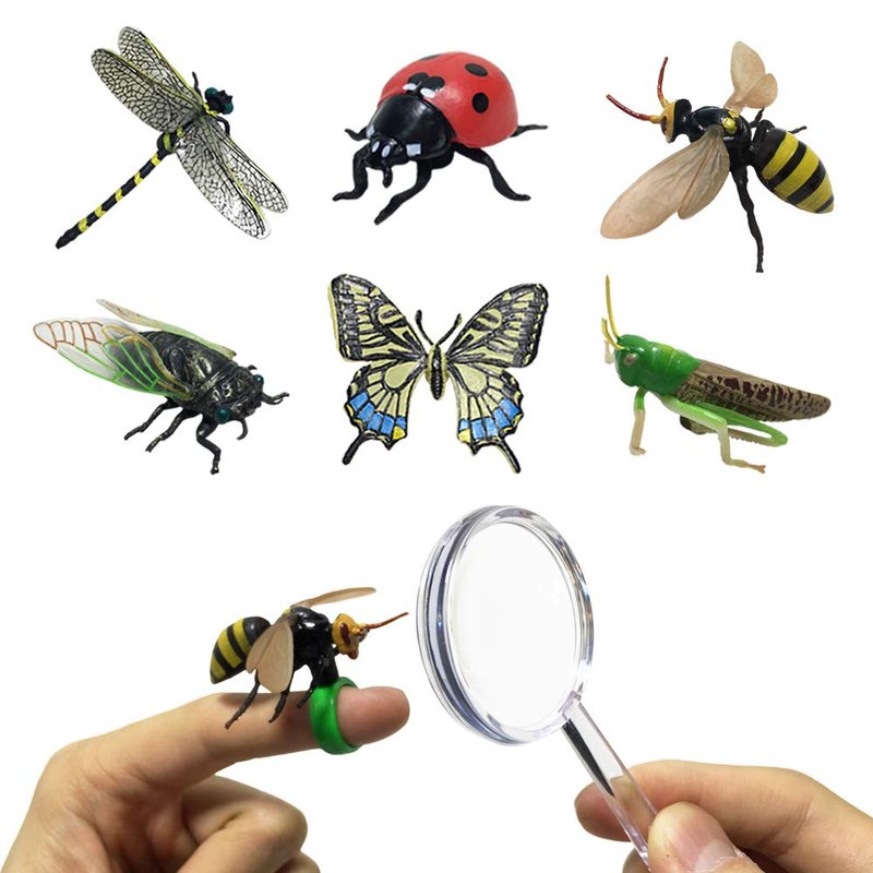 Jollysweets pretend mini insect model 6pcs for kids. Finger ring bugs toy set. Perfect gifts for children to play outdoors and explore nature. Give your little one endless hours of fun in insect seasons.Includes 6 kinds of pretend play bugs which are dragonfly*1, butterfly*1, grasshopper*1, bee*1, ladybird*1, cicada*1.You can assemble the ring to the bottom of the bug and wear it on your finger. These bugs are exquisite. You can even see the fine details on them.
