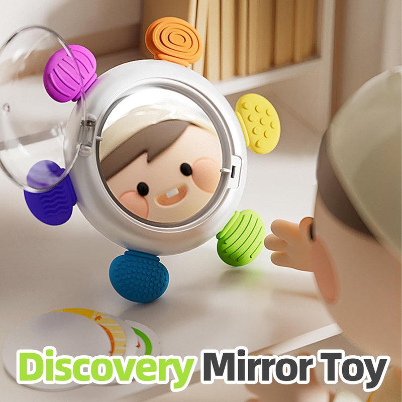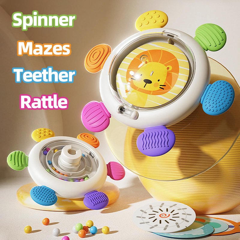 - Early Educational Toy - The multi-functional enlightment spinner toy, features a transparent window at the top, a maze at the bottom, rounding with 6 textured teethers. There are 12 reversible flashcards (including 3 animal cartoons, 3 black & white and 6 colorful geometry images), and a distorting mirror lens.