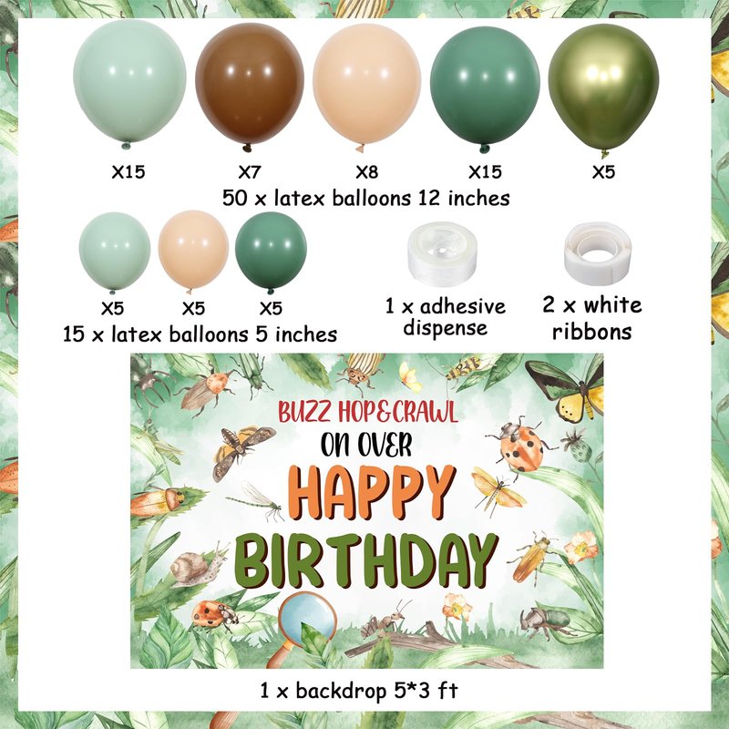 Bug Birthday Party Decorations Includes: 50 x latex balloons 12 inches(15 green, 5 metal green, 8 apricot, 7 retro khaki, 15 light green) 15 x latex balloons 5 inches(5 green, 5 light green, 5 apricot) 1 x happy birthday backdrop 1 x balloon garland strip 1 x 100 adhesive dots