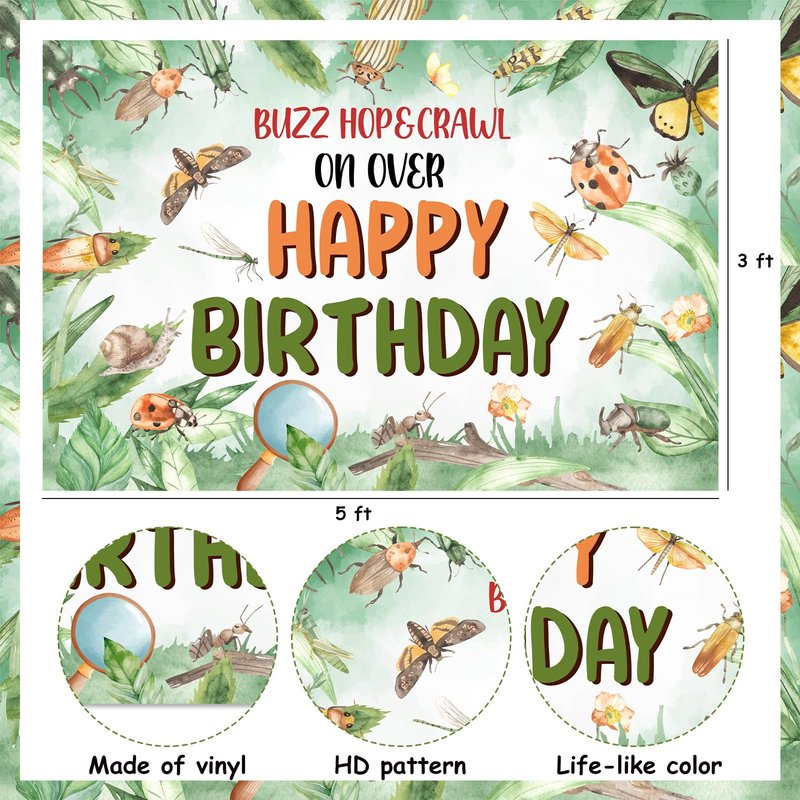- Bug Birthday Backdrop: Bug birthday happy birthday backdrop is 3 x 5 ft, which adopts HD printing technology, printed with insect patterns and happy birthday words; insect backdrop can give you a comfortable visual experience, adds strong atmosphere to bug birthday party