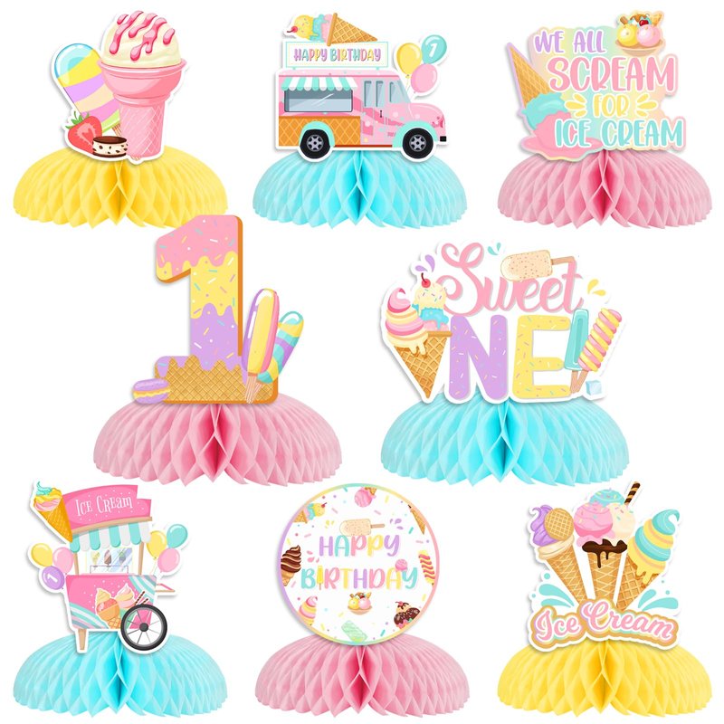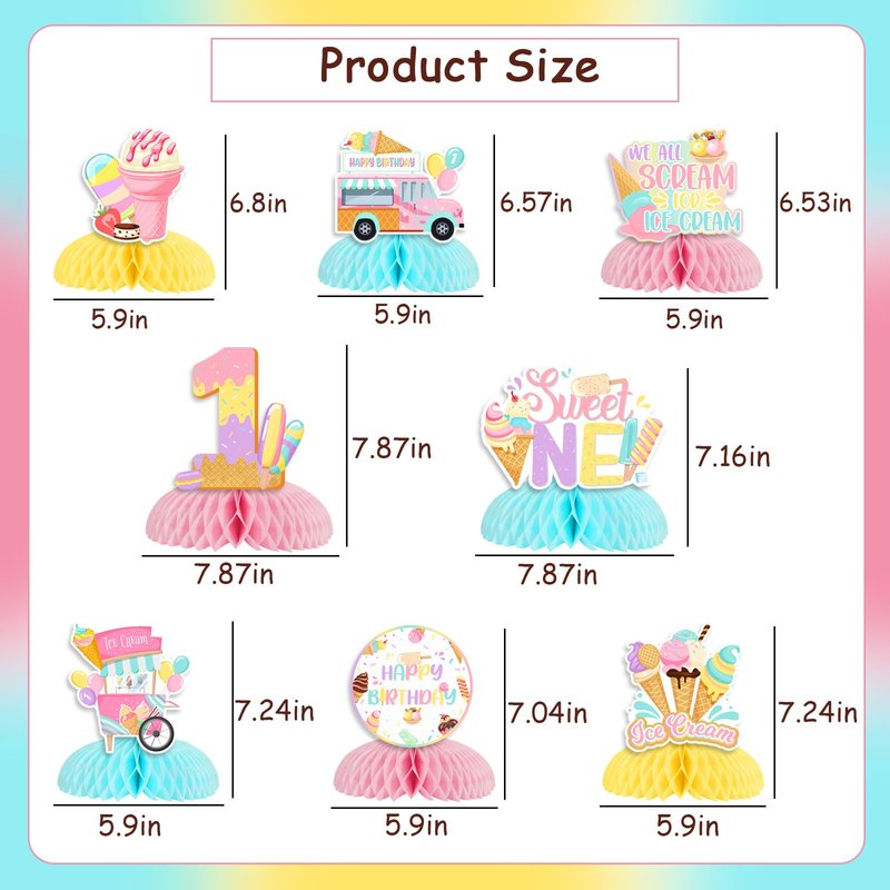 - Package Includes: You will receive 8 x ice cream honeycomb centerpieces, including 2 pieces 8-inch and 6 pieces 6-inch, these cute ice cream honeycomb centerpiece can help you hold and unforgettable ice cream theme 1st birthday party