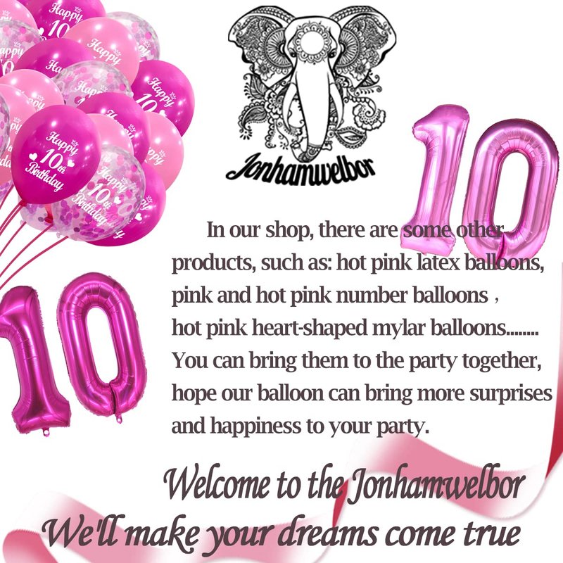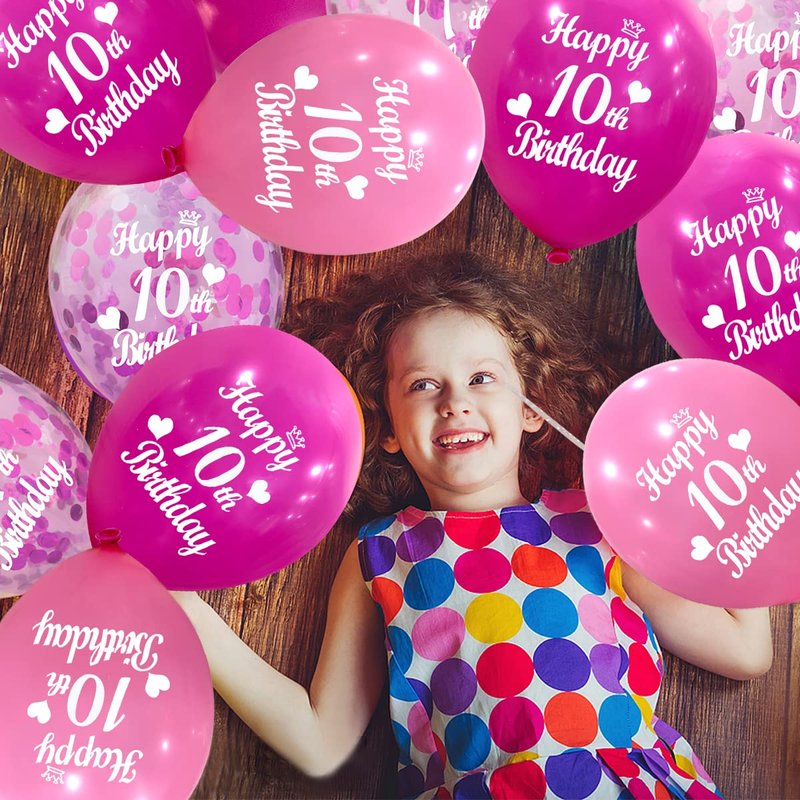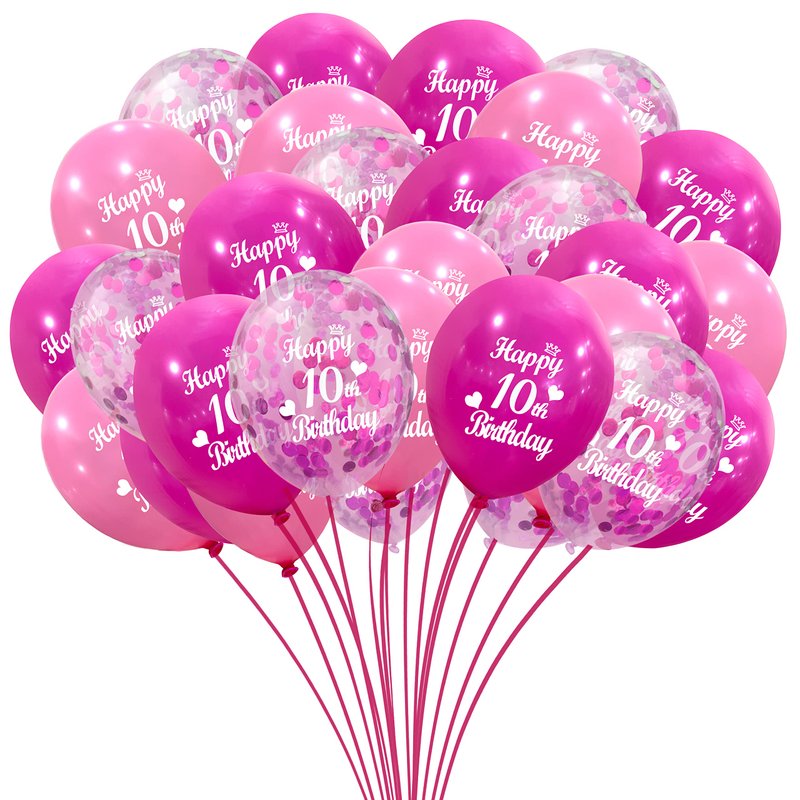 - Package Content:10th birthday latex Balloons with 10 pieces 12 inch pink latex balloon printed"10th Happy Birthday",10 pieces 12 inch baby pink latex balloon printed"10th Happy Birthday",10 piece 12 inch hot pink confetti balloons.These dark pink, baby pink and hot pink confetti balloons will create a joyous atmosphere and leave unforgettable memories for you and your party guests.