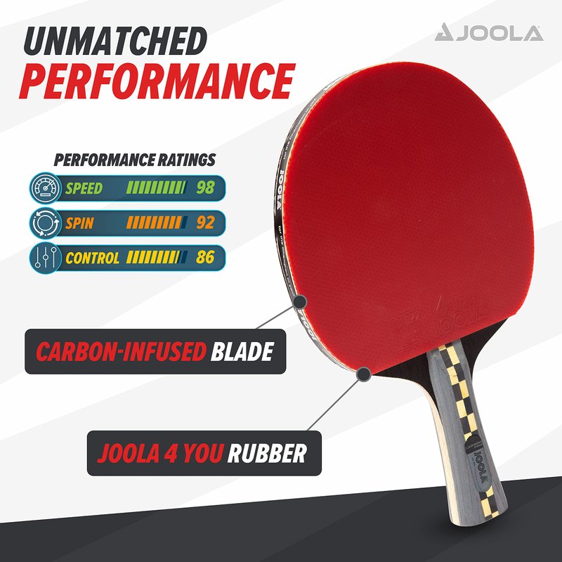 - PERFORMANCE RATINGS (SCALE 0-100) - Speed: 98, Spin: 92, Control: 86. Includes 1.9mm JOOLA 4 You Rubber on both sides. Does not come with ping pong balls. Great gift for someone who already owns an indoor or outdoor JOOLA ping pong table.