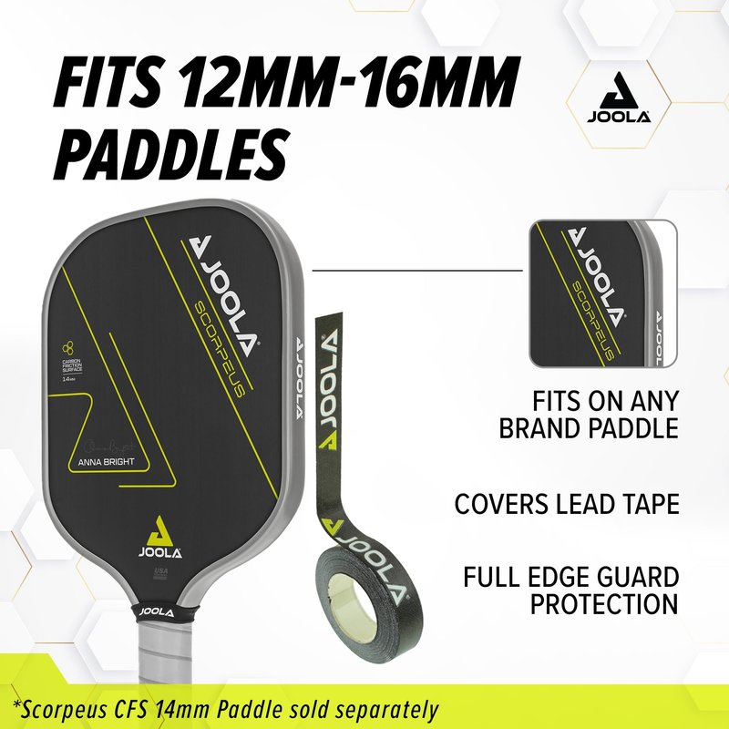 - FITS ALL BRANDS & MOST PADDLE WIDTHS: Edge wrap is 15mm wide and fits most pickle ball paddles 12-16mm thick. Sleek black tape features a repeating white JOOLA logo and lime green trinity icon.