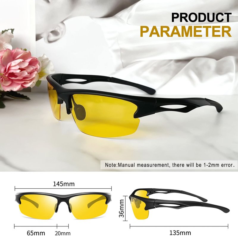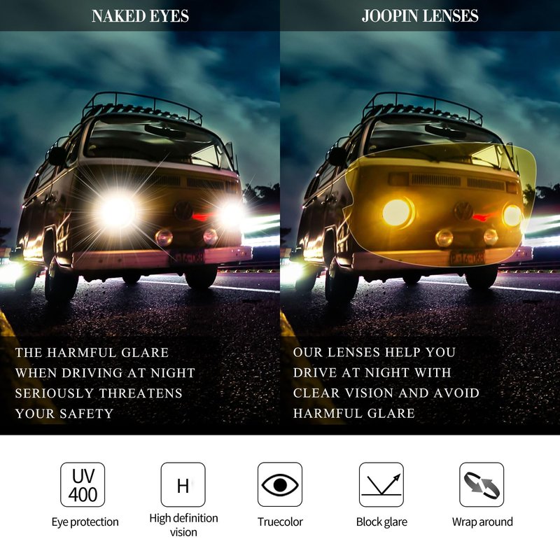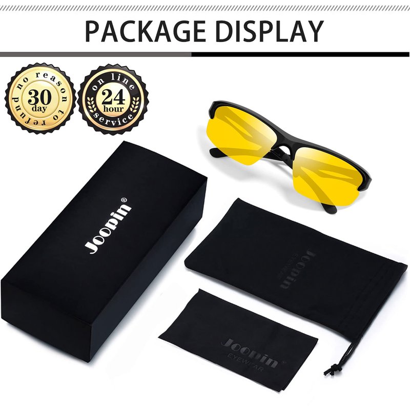 - ✔HIGH DEFINITION NIGHT GLASSES for EASIER DRIVING - Joopin night driving glasses can reduce glare from oncoming car headlights or sharp reflections. Yellow tint sport glasses are designed to reduce the brightness of white light. Scratch-resistant yellow lens sunglasses can improve contrast and visual clarity, providing more soft yet accurate vision when driving at night or cloudy, foggy, rainy days. Enjoy a unique healthy safer driving experience with our night vision shades for men and women