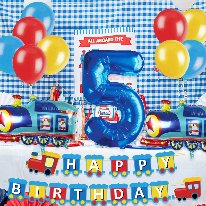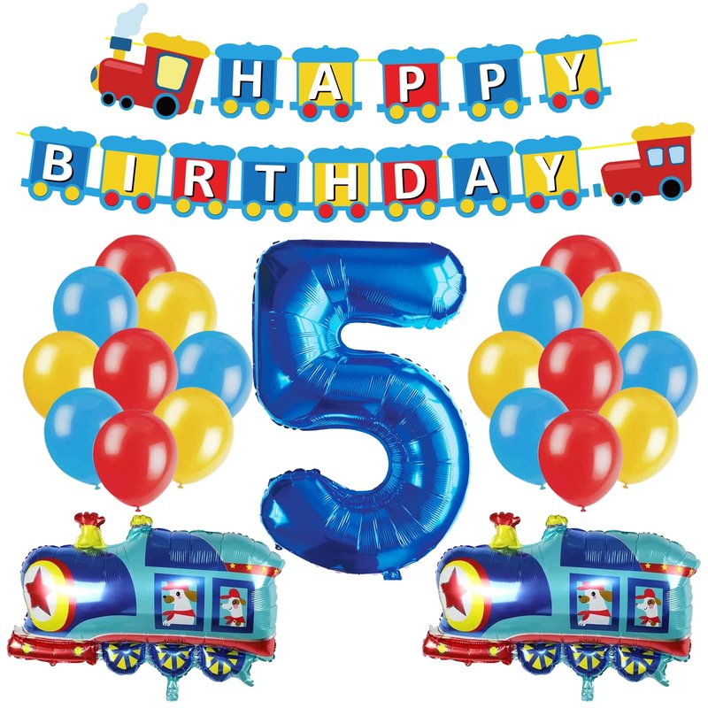 - šćWhat You Will Getć-1pcs train HAPPY BIRTHDAY banner,2pcs train foil balloons,1pcs number 5 foil balloonļ¼18pcs latex balloons(blue *6,yelloow *6 red *6).Totle 22pcs to help you decorate your kids 5th birthday party.