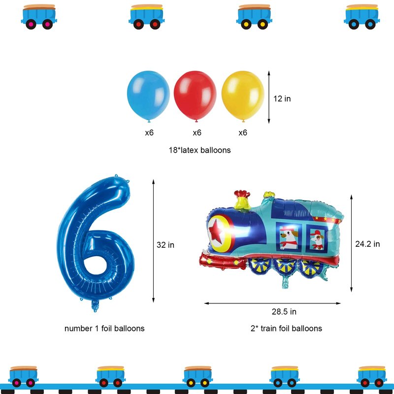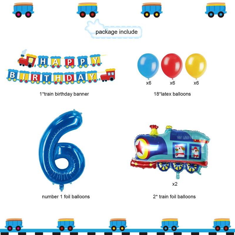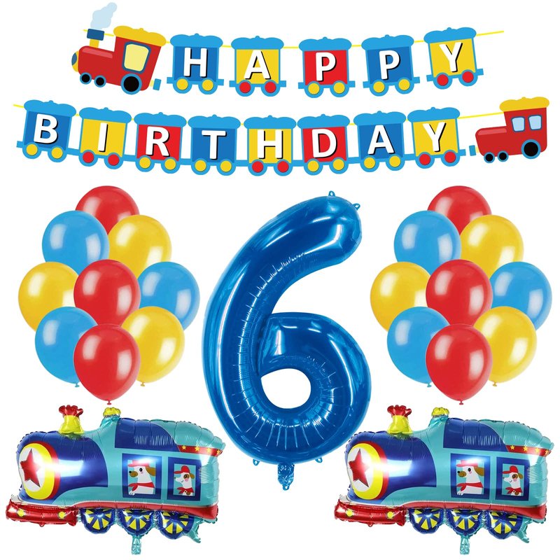 - šćWhat You Will Getć-1pcs train HAPPY BIRTHDAY banner,2pcs train foil balloons,1pcs number 6 foil balloonļ¼18pcs latex balloons(blue *6,yelloow *6 red *6).Totle 22pcs to help you decorate your kids 6th birthday party.