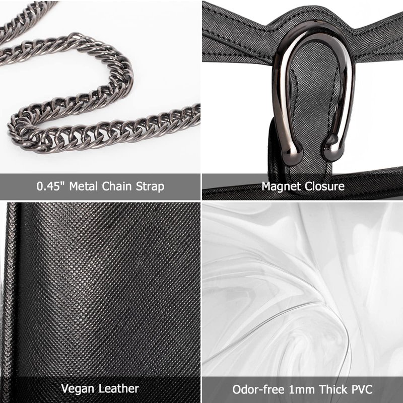 - Elegant, Luxury and Durable: We made this clear handbag shoulder bag with high fashion quality standards to keep you elegant in any event. Crafted from heavy-duty 1 mm thick PVC and vegan leather trim, nickel-tone hardware, chic grommets details, and front flat magnetic closure. This durable and luxurious bag is odor-free and not easy to get defects such as cracks, punctures, melt, or disintegrate.