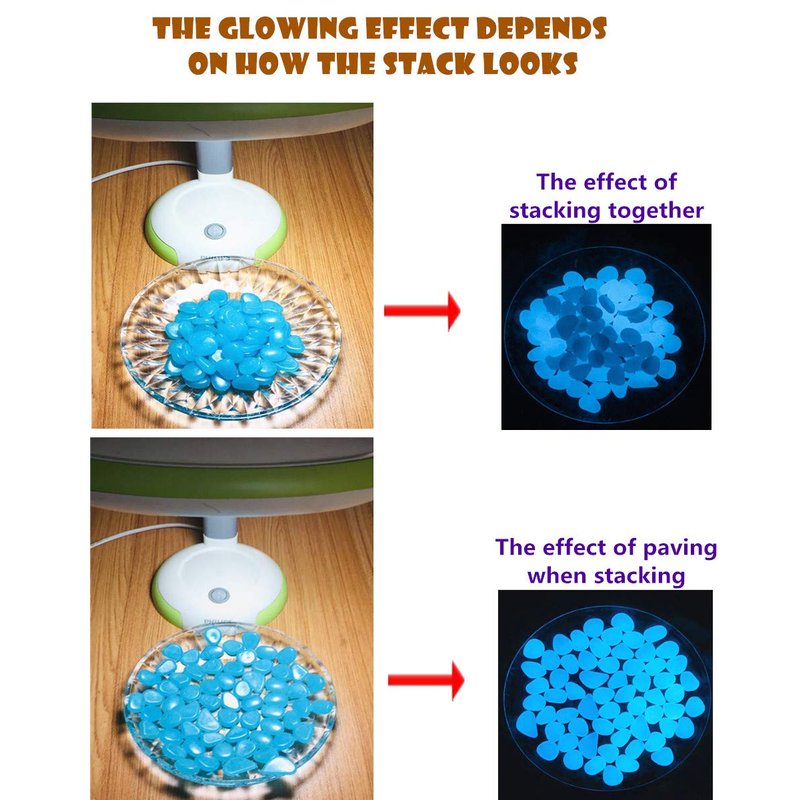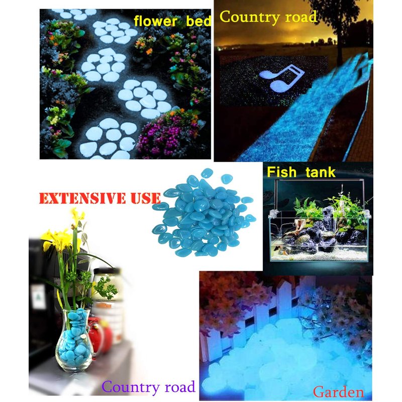 - Glow in the dark pebbles : Add a dash of colored light to your walkways,backyard paths, use them as fish tank rocks in aquariums, dress up patios, pavers, waterscapes, and gardens.They can be used to decorate the garden flower pots, to mark paths or as a border for plant beds or ponds.It can be applied to pool, bar, vase decors, fish tank,aquarium and party.