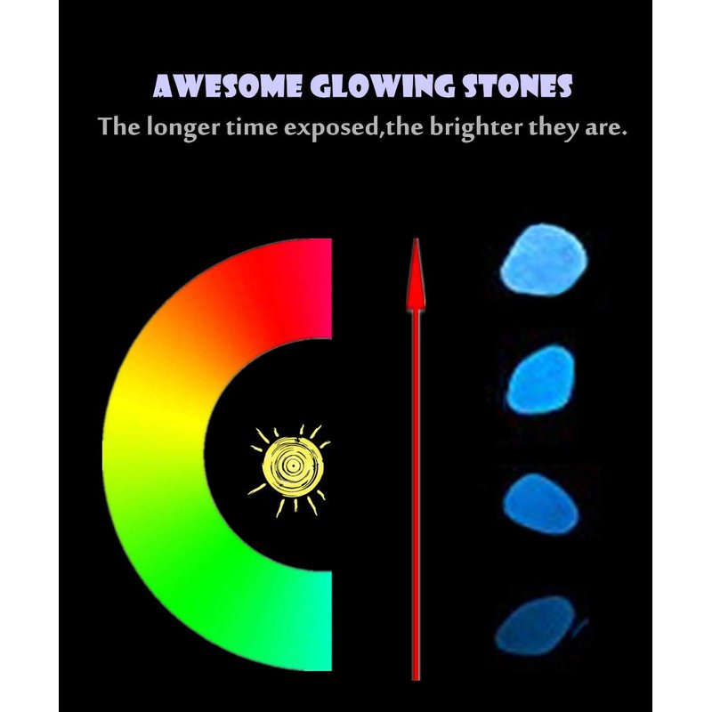 - Glow in the dark rocks : When you receive the parcel please kindly put all the pebbles under the sun for about half an hour to make them charge fully for the first time use, then you can watch in the dark, they will glow brightly. They will last the glowing for about 2 -3 hours in the fully dark space. They can charge and glow repeatedly.