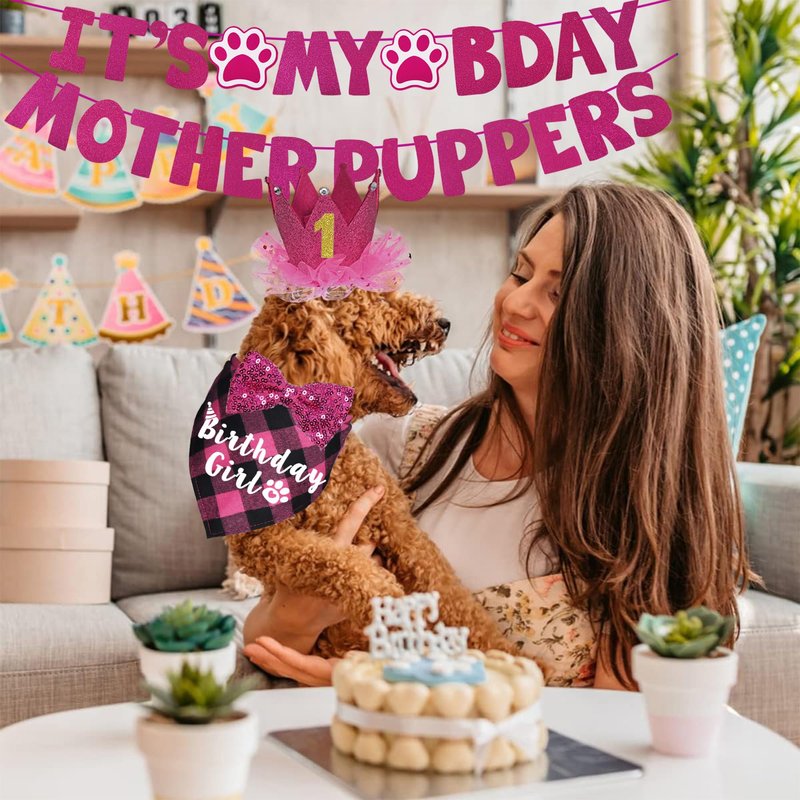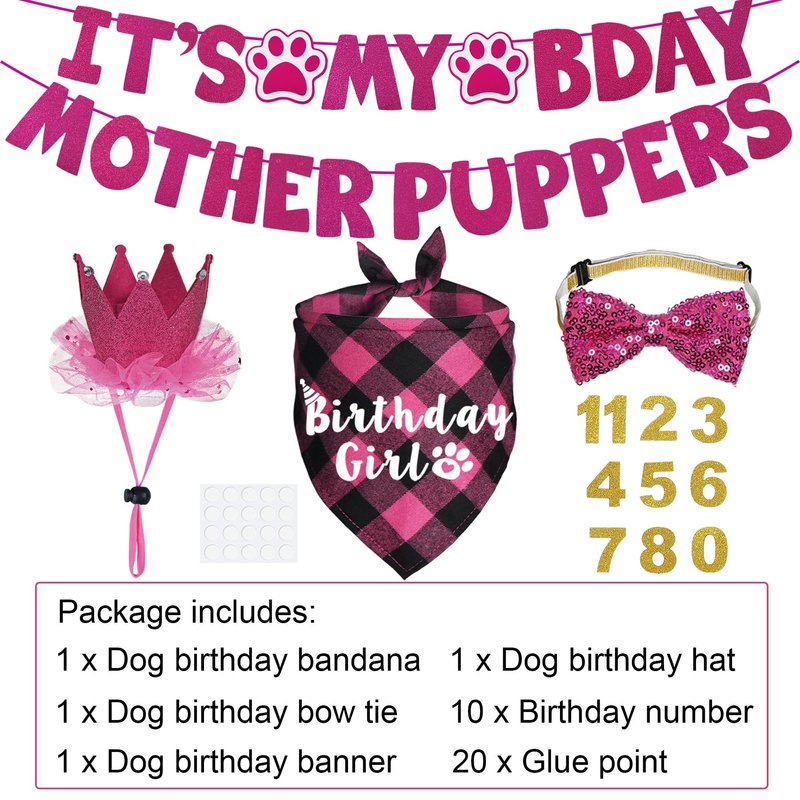 - Dog Birthday Party Supplies: This dog birthday decorations set includes a pink buffalo plaid dog birthday bandana printed with Birthday Girl, a pink bling dog birthday hat, a pink dog birthday bow tie collar, a dog birthday sign banner printed with It’s My Bday Mother Puppers, 10 shiny birthday number and 20 glue points. Enough quantity allows you to dress up your beloved pet lovely, let your pet have an unforgettable birthday party.