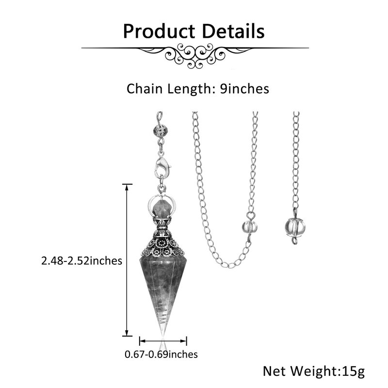 - Pendulums Details: The length of crystal stone Pendulum is about 63-64mm(2.48"-2.51"),width is about 17-17.5mm(0.67"-0.69").Chain length is approx.9" and whole length of the pendant is about 11.5".High quality natural crystal chip stone and resin.
