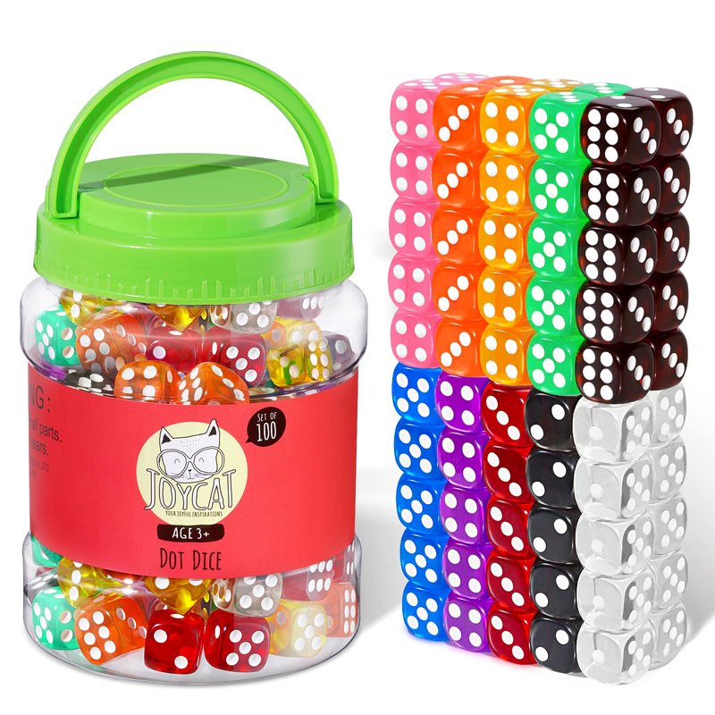 - 10 Color Dot Dices Set: 100pieces 6-sided dice in 10 assorted colors supplied in a reusable storage container, easy for storage and carrying.