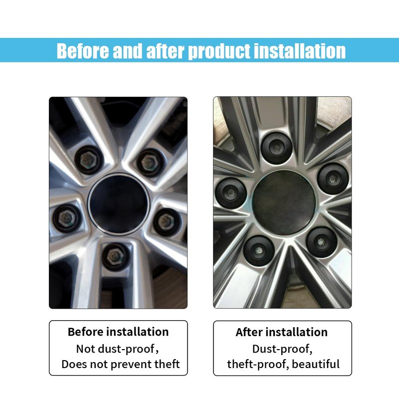 - 【Effective Protection】:These lug protection caps prevent the bolt heads from coming into contact with debris, dirt, rain, and other small debris, preventing the wheel bolt heads from wearing out and chipping, preventing the screws from rusting and falling out, and keeping the wheels new.
