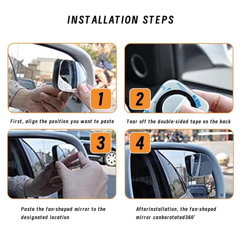 JOYCOURT 2PCs Automotive rearview mirror Blind spot mirror, adjustable HD sector mirror, frameless wide Angle convex mirror, most automotive side mirror auxiliary mirror Specification: Brand: JOYCOURT Name: Car Rearview Blind Spot Mirror Colour: Silver Material: HD glasses Size: 1.77*0.3inch Applicable: Most of the vehicle Features: - 100% brand new high-quality HD glass, Material selection is strict, quality assurance. - 1.77*0.3inch HD glass curved bezel-less ultra-thin design, fashion, elegant, fan-shaped appearance thin, highly waterproof, rust-resistant, durable, strong. The set includes 2 fan blind-spot mirrors. - Wide Angle, high definition 360 degree adjustable HD glass convex wide Angle rear view. Convex mirrors are designed to expand the field of view, maximize the field of view area, and make driving safer.