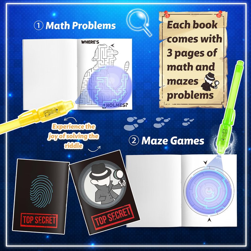 - SPY THEMED NOTEBOOK - These invisible ink pens and notebooks are awesome for kids who love all things spy-themed! Each mini notebook is loaded with fun puzzles and arithmetic problems to keep children engaged and entertained. This spy kids party favors is sure to be a hit and bring children hours of fun with their friends or family at a spy party!
