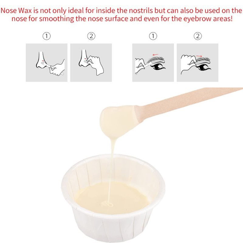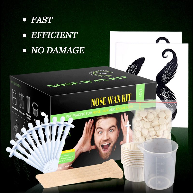 - Wax Nose Hair Removal Kit at Home Salon - Nasal nose hair wax kit package include 50 grams hypo-allergenic nasal wax, 10 nose wax sticks, 10 nose wax paper cups, 1 mustache protecotr, 5 wooden applicators, 1 measuring cup and user manual, one-stop ear hair, nose hair and eyebrow remover, results last for up to 5 weeks.