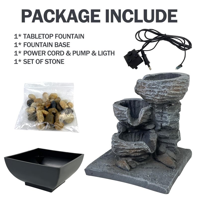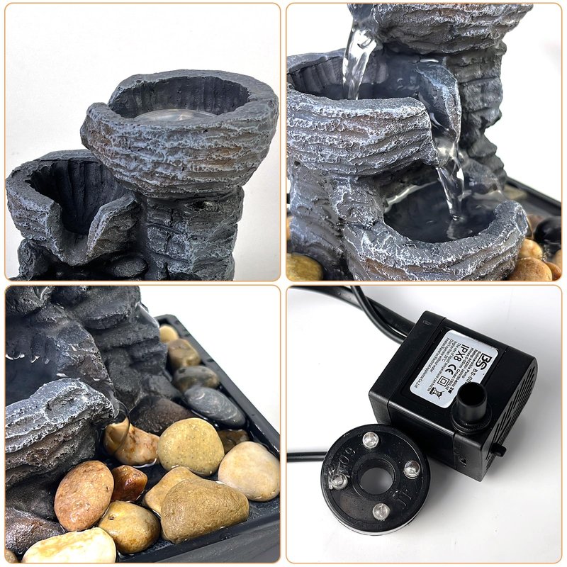 - Decorative Tabletop Fountain - Bring a calming, zen, and decorative feel to any room, 3 tiers of water merging into a small waterfall, under the decoration of colored lights, the fountain adds beauty and tranquility. Perfect for decorating any table, desk, bedroom, bathroom or vanity in the room. Suitable to use around pool/pond/tanks/aquarium.