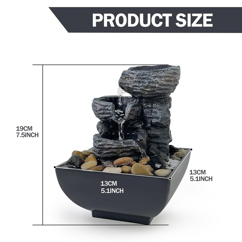 - Size: Approx. 7'' x 5'' x 5''. The water flows from the top to the rock bed, like the sound of the waterfall. It is suitable for any table in your home and adds atmosphere to your living room, office.
