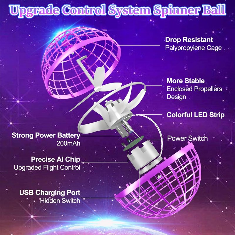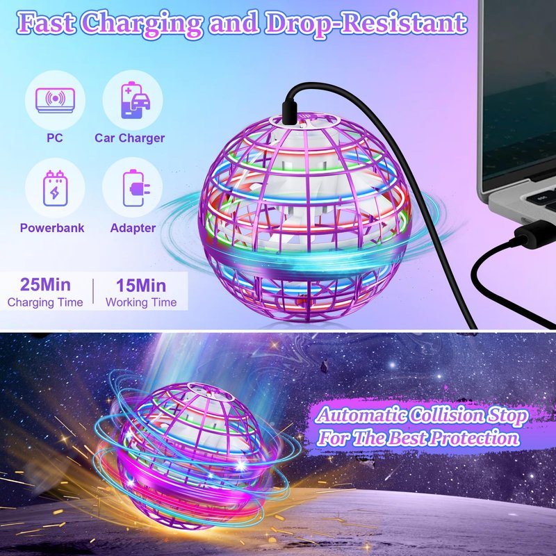 - 💫【Rechargeable Design & Portable Flying Orb】Power the cool manual flying spinner mini drone ball up by USB cable for 25 minutes to get fully charged and a single charge will give you a full 8-10 minutes of tricked-out flight time.Wherever you go, the flying spinner mini drone for kids can easily carry, and will not take up a lot of space. Besides, Magic flying ball have two colored lights, the floating ball toy will look like a neon shooting star when you launch the drone ball across the sky.