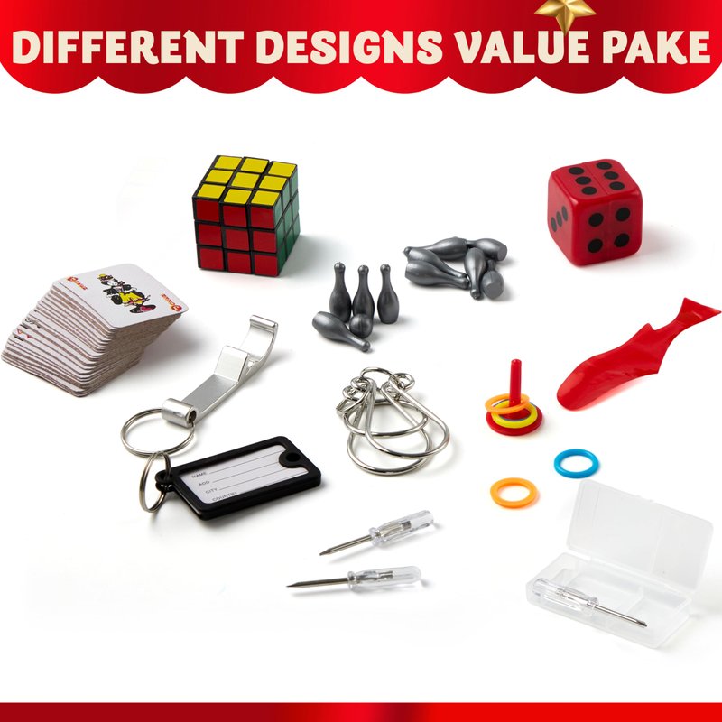 - PERFECT GIFT: Our favors is a perfect party favor for your Xmas traditional celebration, novelty gifts, birthdays, presents, special occasions, and many more! Gifts include: Playing Cards, Ring Toss, 10 PCS Bowling set, Fortune Telling Fish, Mini Screwdrivers Set, Keyring with label in black, Bottle Opener, Metal Puzzle, Magic Cube & Red Dice.