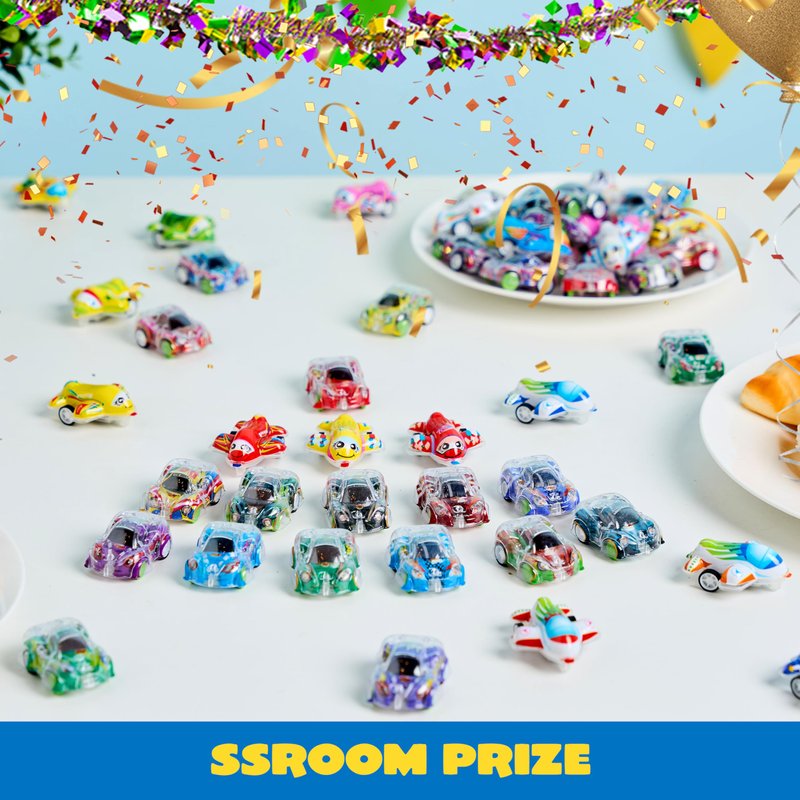 AWESOME PARTY FAVORS: This Mini Pull Back Cars Set has 50 cool little cars and 50 airplanes for racing fun! Perfect for goodie bag stuffers, treasure box rewards, or pinata fillers that boys and girls will love. VARIETY OF DESIGNS: With up to 20 different design types, kids will love racing a variety of colorful and fun mini cars, keeping the excitement going for hours. RACE WITH FRIENDS: These mini pull back cars are great for group activities, team games and friendly races, encouraging kids to work together while having fun. FUN FOR EVERYONE: These mini cars are perfect for birthday parties, classroom prizes, presents, and other celebrations. They are great for entertaining large groups of kids at any event. SAFE AND DURABLE: Made from non-toxic, high-quality plastic, these cars are safe for kids to use and built to withstand rough play, ensuring long-lasting fun.
