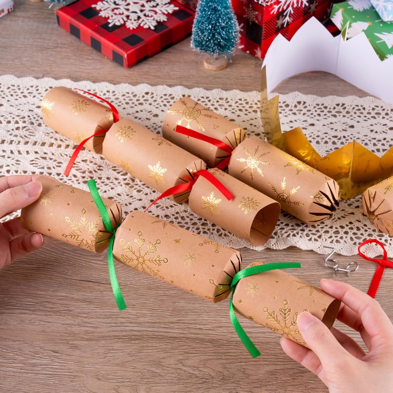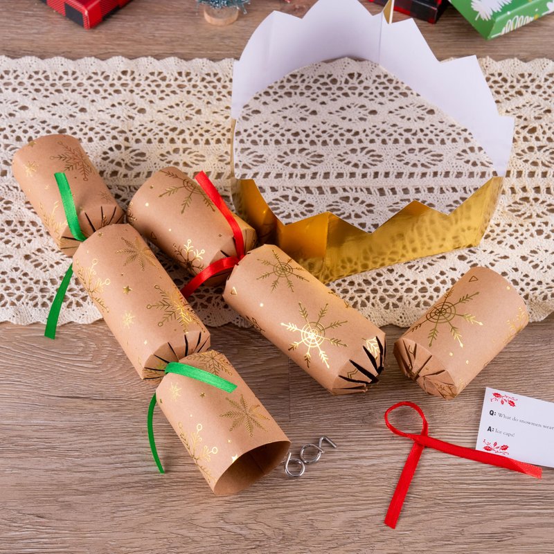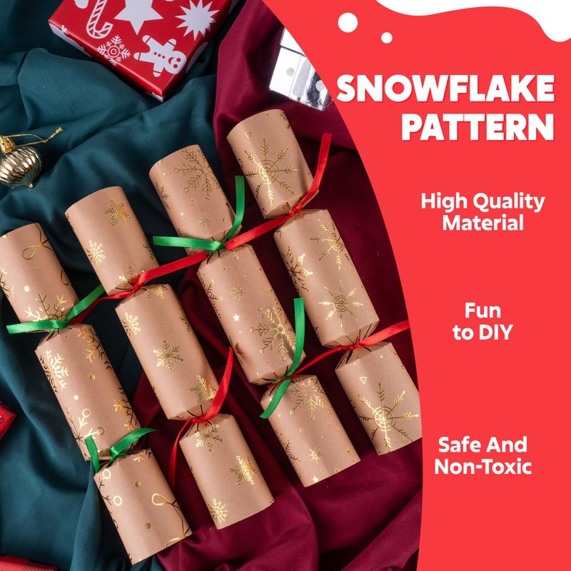 - Snowflake Designs: Our Xmas non-snap party favors kit has 4 different snowflake designs, and each design includes 3 pack Christmas table favors. These party favors are designed with hot-stamped gold snowflakes in kraft paper, bringing an elegant and festive touch to your holiday gatherings.